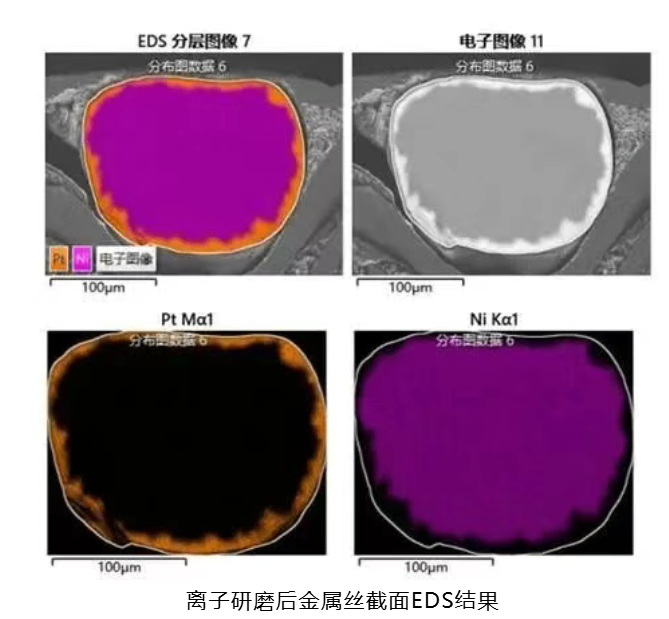 经过离子束研磨后,样品的截面结构得到了显著改善。电镜结果显示,样品表面平整、干净无污染,且Pt和Ni两种成分有明显的分界。通过EDS结果进一步证实了样品由Pt和Ni两种元素组成,其中Ni位于样品中间,而Pt位于样品边缘。金鉴实验室具备专业的EDS设备,能够为客户提供高标准的试验服务。