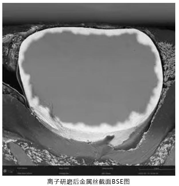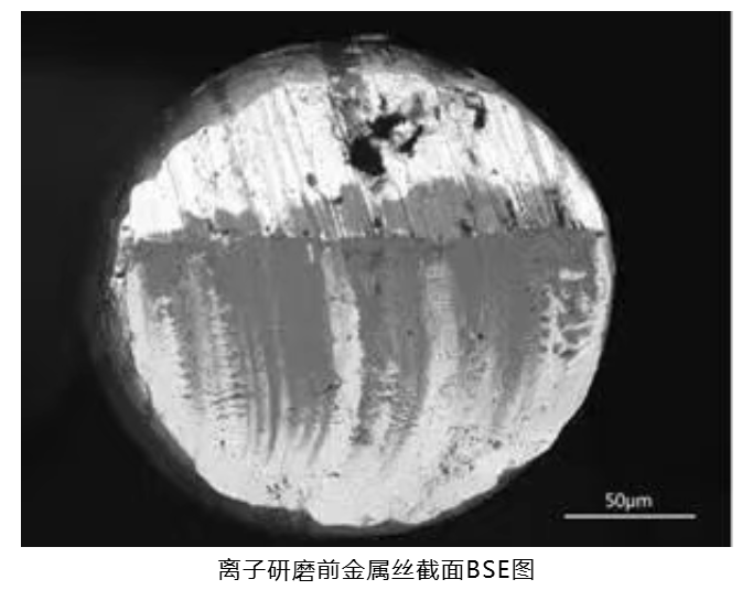 以金属丝样品为例,该样品包含铂(Pt)和镍(Ni)两种成分。在未进行离子研磨前,扫描电镜下的形貌显示,虽然可以分辨出亮度高的Pt元素和亮度低的Ni元素,但两种成分之间并没有明显的界限,且样品表面存在污染物,这可能会影响Pt和Ni的定量分析。