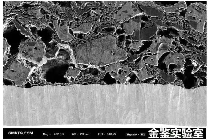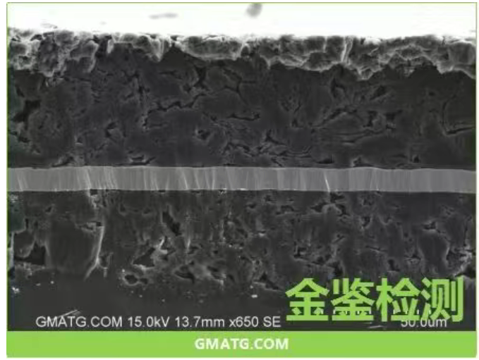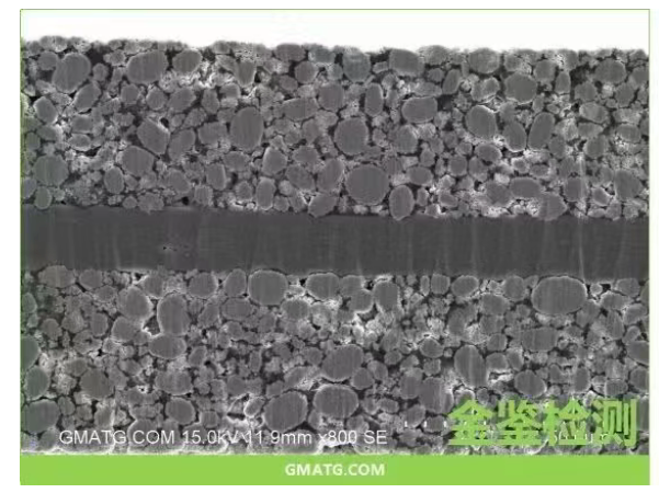 1.石墨极片的氩离子抛光截面制样某石墨生产厂家委托金鉴实验室对其石墨极片进行氩离子抛光截面制样。通过氩离子抛光技术,可以清晰地观察到电极材料涂片的内部结构。抛光前,由于样品是用剪刀剪切而成,截面上的损伤层较大,无法看清真实的内部结构。金鉴实验室拥有专业的氩离子抛光切割设备和技术团队,能够确保制样的准确性和可靠性。而经过金鉴实验室氩离子抛光后,损伤层被完全去除,内部结构清晰可见,孔隙度也能够准确测量,从而为材料的吸液性和寿命分析提供了可靠依据。