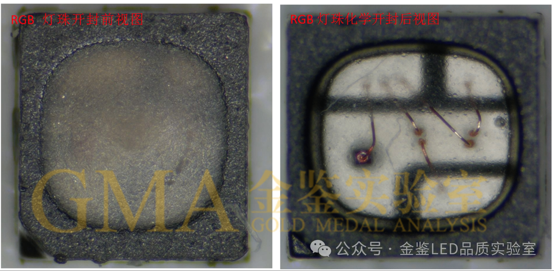 客户送测RGB SMD LED灯珠,化学开封后可清晰看到键合线的状态