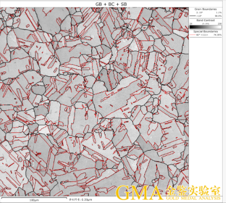 EBSD技术还能够识别具有特定取向差角和轴的界面,如孪晶界面和CSL晶界。这些界面对材料的性能有着显著的影响,因此在材料工程中,控制这些界面的比例和分布是非常重要的。